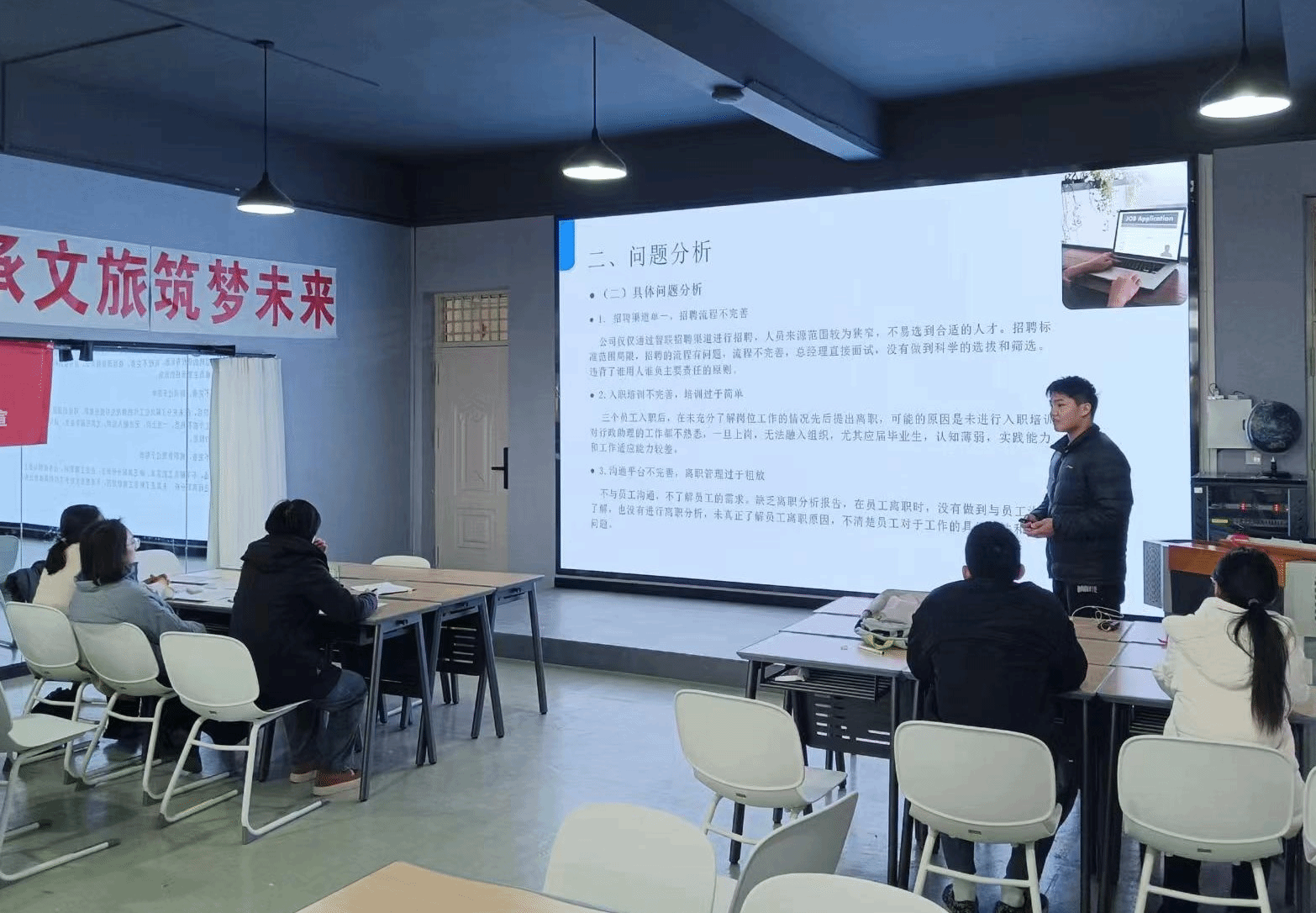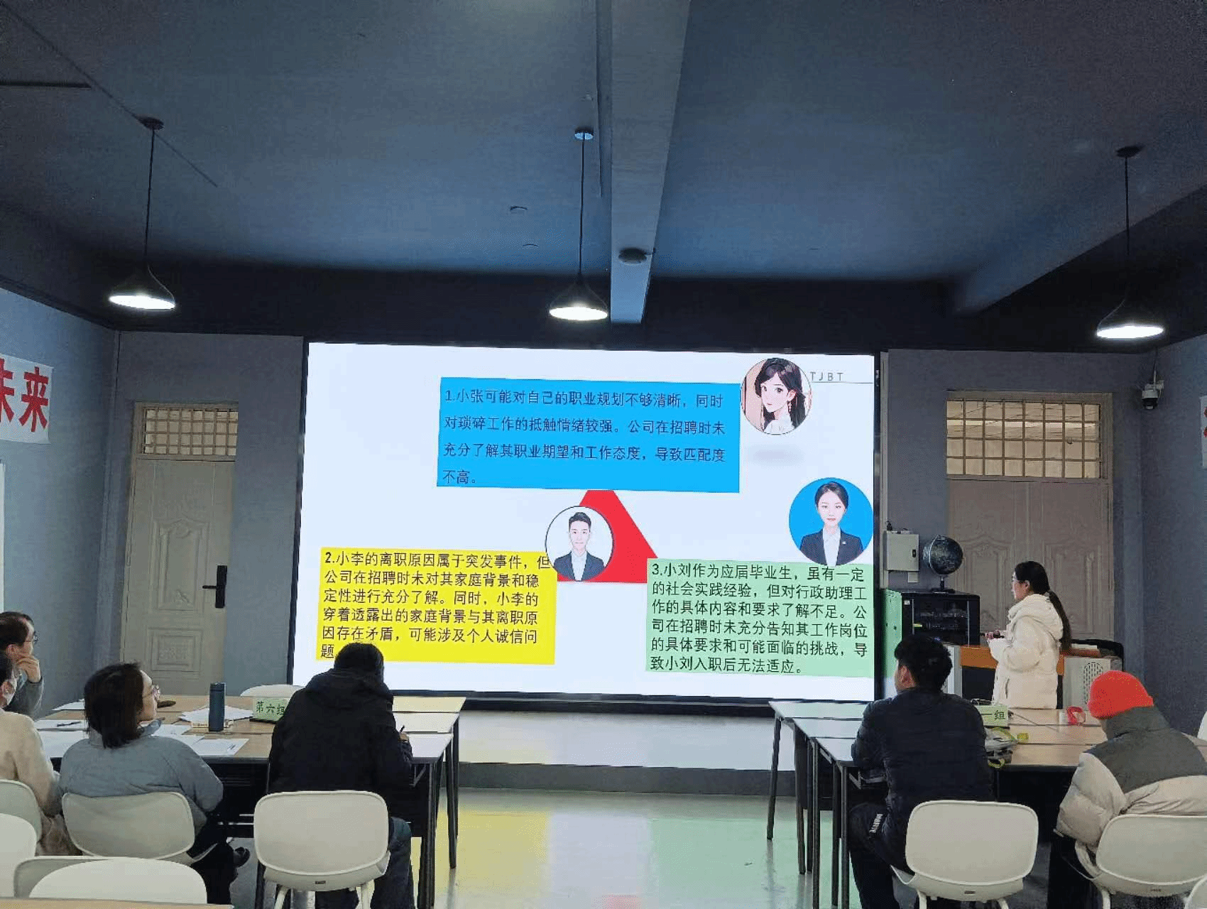 同样的题目,同样的要求,就更加考验选手们的现场展示了。董立阳在代表团队汇报时,对人力资源工作流程的展示、案例中所涉及问题的剖析以及切实可行的解决方案,得到了评委老师的一致认可。吴兰兰团队虽然队员不多,但解决方案的完整性及独特的视角让评委频频点头。赵洋博团队在汇报时,除了内容的完整呈现,精美的PPT制作也得到了评委老师的认可。经过激烈角逐,董立阳团队获得一等奖,吴兰兰团队、赵洋博团队获得二等奖。