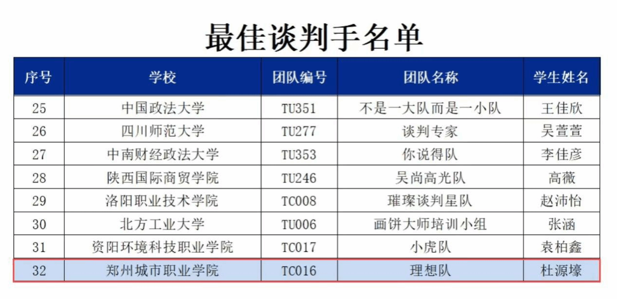 近日,2024年全国高校商业精英挑战赛商务谈判竞赛全国总决赛圆满落幕。郑州城市职业学院斩获全国一等奖1项、二等奖1项,电子商务专业学生杜源壕荣获全国“最佳谈判手”称号。