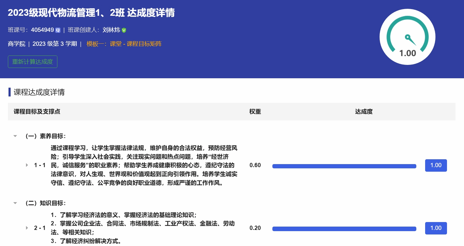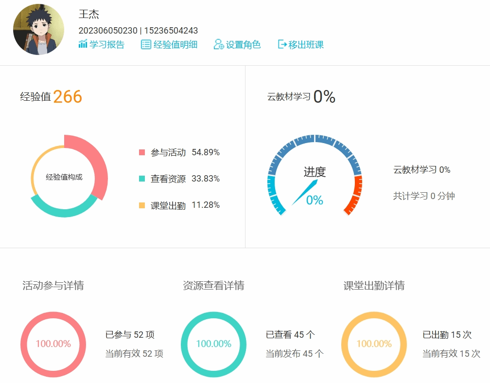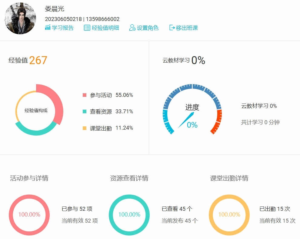 其中,刘林炜老师在本学期所授《经济法基础》为专业必修课,知识点较多,所以根据课程实际在云班课中设置了大量的课堂活动和资源来丰富教学。但由于该课程内容偏理论化,且班级人数较多且为合班课程,截止学期中段,一个班级80多名同学有近1/4出现了预警,其中,现代物流管理专业的娄同学、金同学两位的达成度与经验值为全班最低。