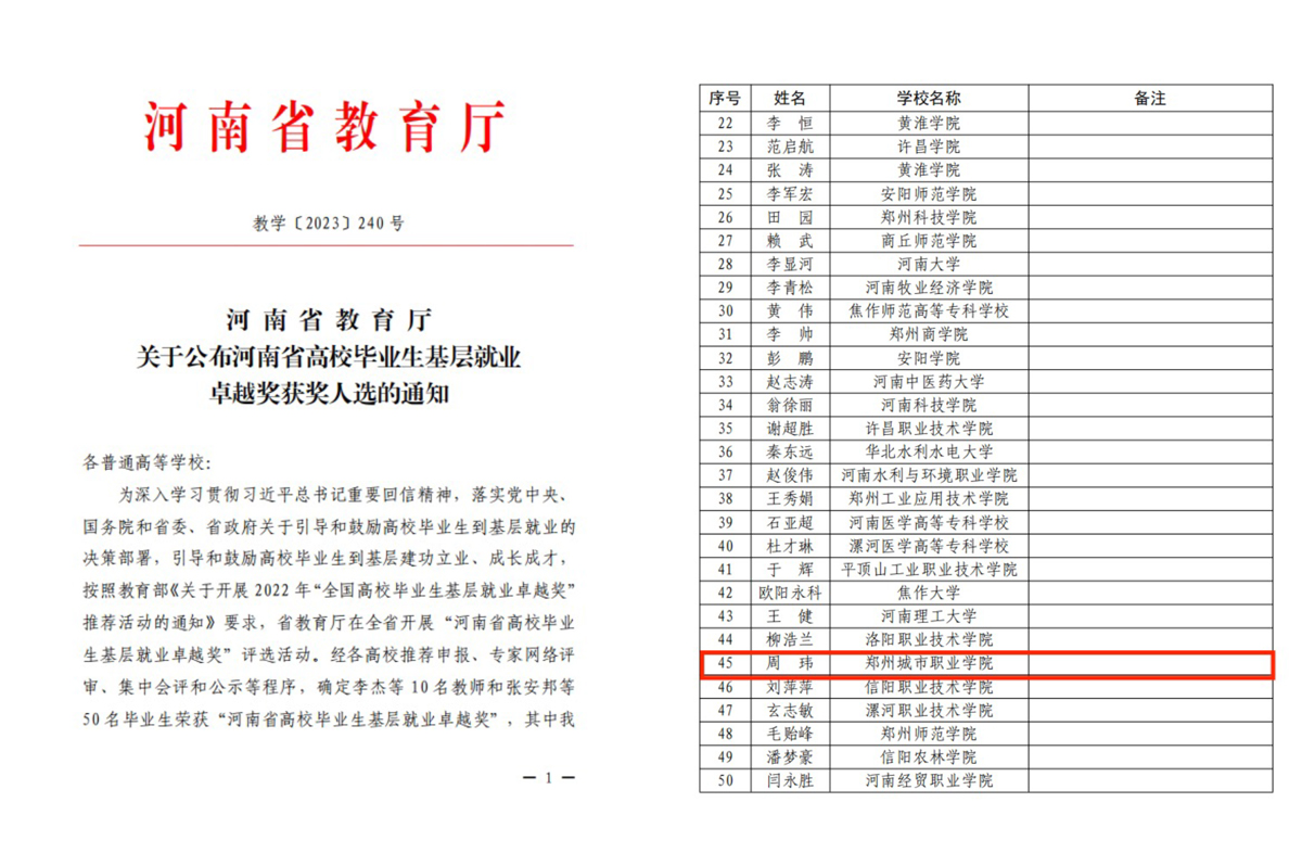 (一)思政教育引领就业观念。学校坚持落实立德树人根本任务,深化思政引领,积极引导学生树立正确的“职业观、就业观、成才观”。通过政策宣讲会、就业动员会、主题班会等活动,宣传解读“三支一扶”“西部计划”“大学生应征入伍”等国家政策,引导学生从实际出发,投身基层、建功立业,毕业生周玮荣获“河南省基层就业卓越奖”。